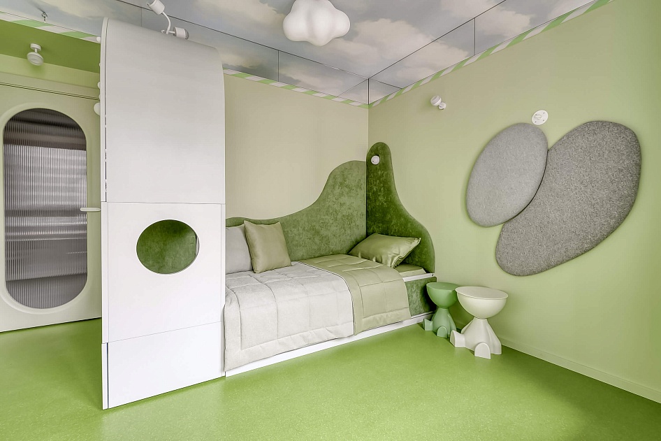 Основным цветом в комнате стали природные оттенки, приближенные к лесной тематике.